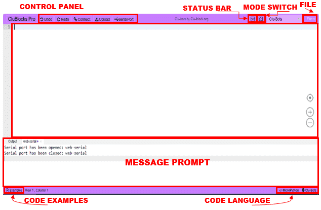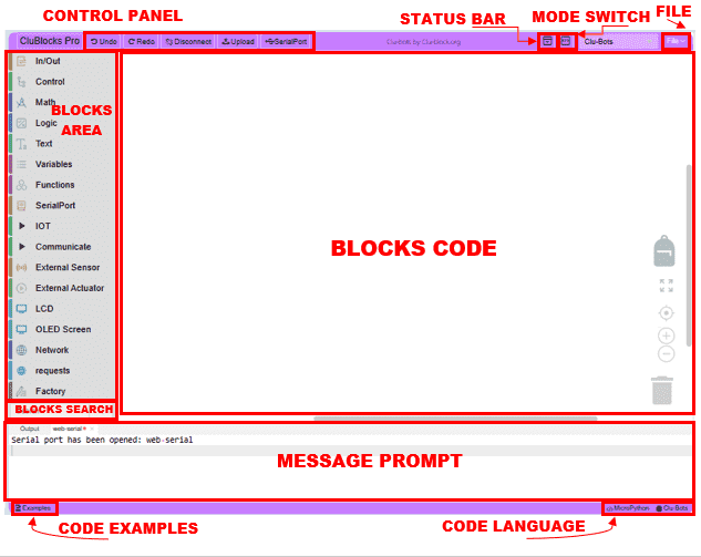 - Message Prompt: Provides useful information during program development. If there are errors, messages will be displayed here to help you identify and correct them. And Serial Port information.