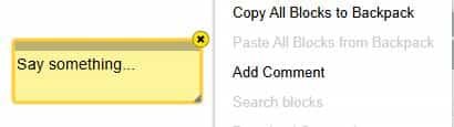 This allows you to add a text comment next to the block. When you right-click anywhere in the block programming area, a small “Add Comment” menu appears. Clicking on it opens a text box where you can type. The comment area can be moved and positioned wherever you want.