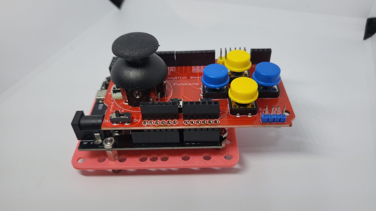 The joystick shield is like a game controller for the robot. It has a small stick that can move in different directions (X and Y) and several buttons that can be pressed.