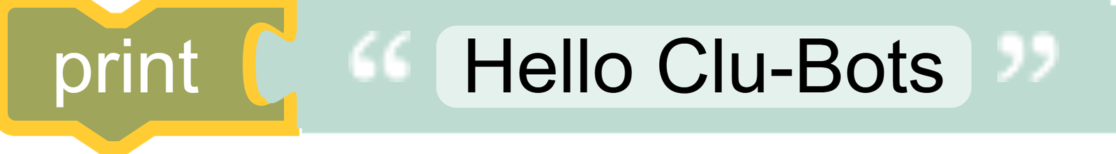 - Challenge: Change “Hello Clu-Bots” to your name or a fun phrase.